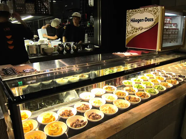 一進門左邊就是開放式廚房,前面冰櫃放了一盤NT$80的小菜與一盒NT$105的哈根大斯