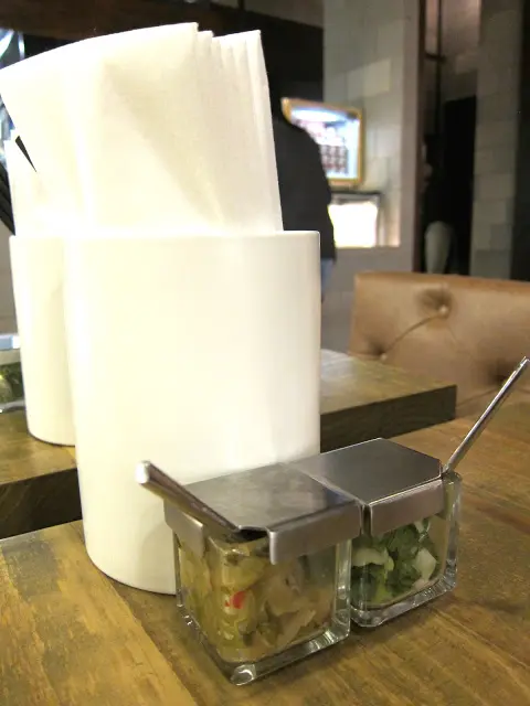 每桌桌上都已經擺好的餐具與醬料,小小盅的酸菜和蔥花