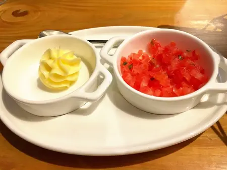首先上桌的當然是手工麵包籃,有可頌及法國胚芽小圓麵包,可頌外皮很香酥,缺點是很容易散落一桌,小圓麵包則帶點淡淡甜味,不用加奶油及蕃茄丁就很好吃。
