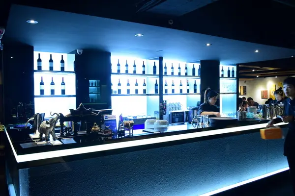 店內可是別有洞天,裝潢採用時尚雅緻卻有帶有Lounge氛圍的用餐空間,摩登的吧檯加上整排紅酒櫃,為空間挹注都會饗宴氣息,而寬敞舒適的通透格局與分明動線,予以愜意舒適的歡樂感受。