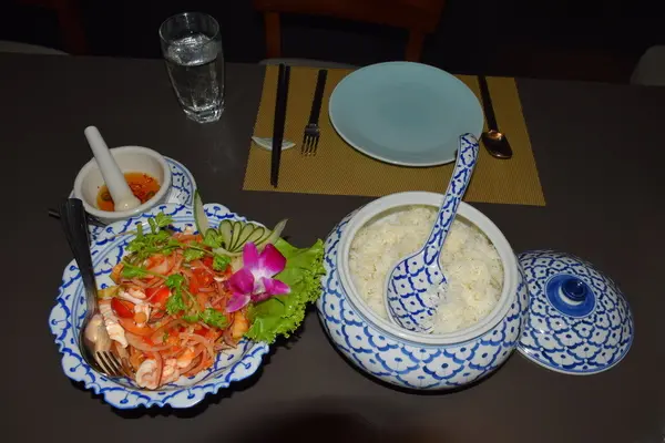 一般泰式餐廳都會使用錫製的器皿裝白飯,泰集使用帶點中國風的青花瓷器餐具還兼具保溫效果,白飯用的是標準泰式長香米,粒粒分明,彈性品質不錯。