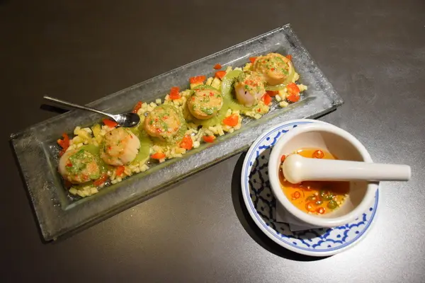 酸辣口感的【泰式酸辣煎干貝】Q彈的日本干貝底層搭配整片酸甜奇異果,及蘋果丁、柳橙丁,充滿果香及海味,白綠搭配不但視覺美觀,更讓水果更襯托出海味的鮮美。前菜的口感都非常開胃。