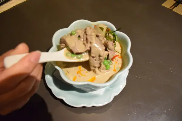 【綠咖哩香椰沙朗】沙朗牛肉質軟嫩,搭配充滿辛香料的嗆辣綠咖哩醬汁更添風味,濃濃的椰子味非常好下飯,獨特風味推薦給重口味的朋友,濃烈調和得宜。