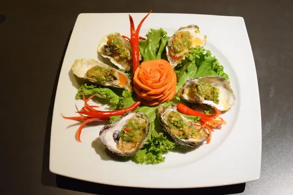 【酸辣炸牡蠣】擁有碩大肥美的一顆顆澎湖牡蠣,裹上薄薄地瓜粉下鍋油炸至表皮酥脆,淋上充滿香茅香氣的泰式醬汁,酸香滋味的開胃創意菜,趁熱剛上桌 Q嫩口感不自覺就咕溜進嘴裡,頗受一致讚賞。