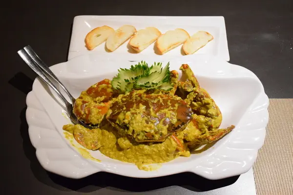 剛端上桌的【咖哩螃蟹】真是吸睛,這豪華的螃蟹造型擺盤也太氣派,還不用動筷就能聞到海味鮮香,滿滿蟹黃更讓人看得口水直流。