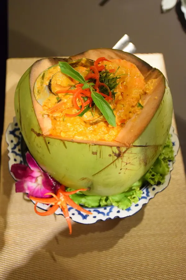 直接把椰子殼當作器皿端上桌的【椰子蒸海鮮】,以紅咖哩、雞蛋、椰奶,先煮後蒸,呈現粉橘色調,入口微辣卻溫潤,熬煮濃郁的口感,只是品嚐多道綠咖哩、黃咖哩、紅咖哩後,今天真的好奢侈、泰超過哦!