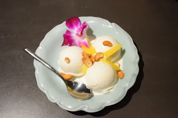 【泰椰冰】共有三球椰奶冰淇淋,搭配椰奶、芒果條、腰果,很喜歡椰奶冰淇淋香濃而不過甜的口感。