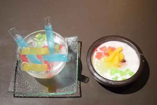 具南洋風味的【摩摩喳喳】(右)用料非常豐富,椰奶加上西米露、斑蘭和石榴口味的果凍、波蘿蜜、亞達枳、紅豆等等......為這頓美味的佳餚畫下完美句點。