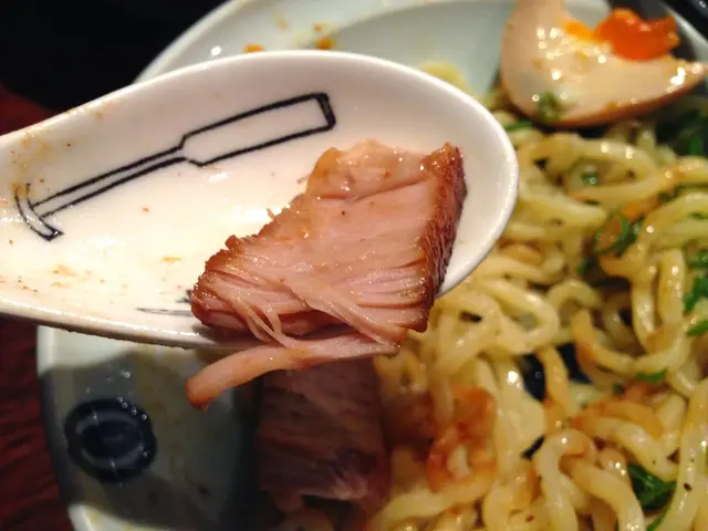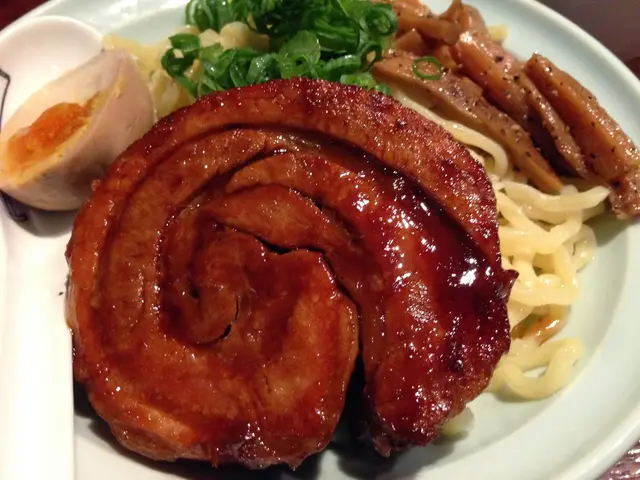 看到這塊肉我就心滿意足了阿~在神山店的沾麵只有一塊長寬高約4cm的正方形五花肉,而虎嘯店是將大塊的叉燒肉捲綁,形成這樣的螺旋狀,表面看起來很濃厚的醬汁,看了就口水直流!