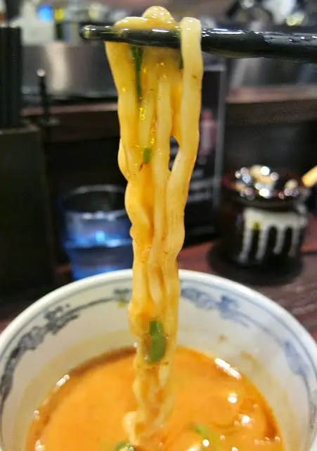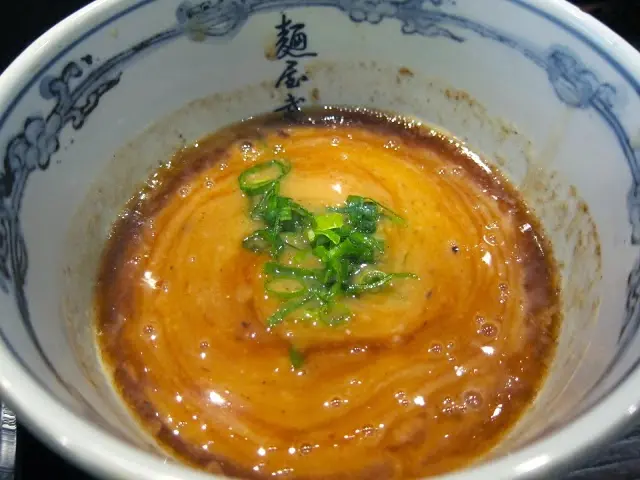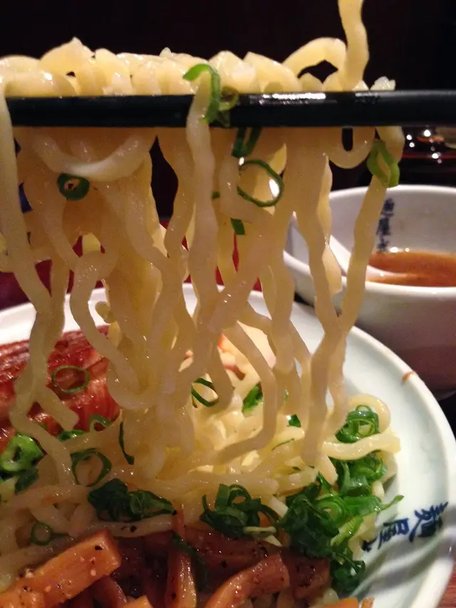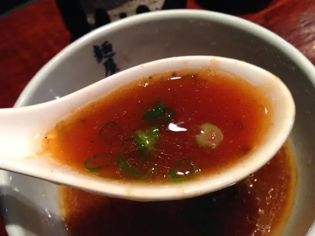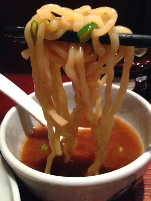 再來是麵條,是我喜歡的類辛拉麵,(就是跟辛拉麵很像的麵條,我不喜歡太細太直的麵條)湯頭部份,據菜單上的說明,是重現新宿本店的招牌沾汁,跟神山店比起來,比較清澈一些,神山店的感覺已經像是沾醬而不是沾汁,濃稠到好像快變成固體(請見下圖)