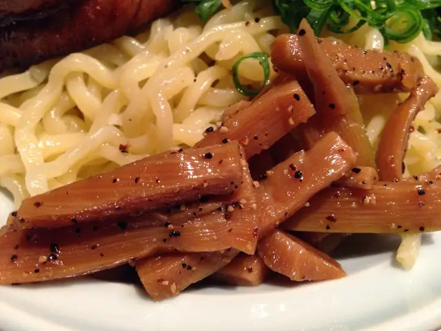 麵條旁邊附上的用黑胡椒調味過的筍子很好吃~帶有一點酸酸的清爽感,黑胡椒又多了一點香氣,單吃或跟麵條一起沾醬汁吃都很不錯!