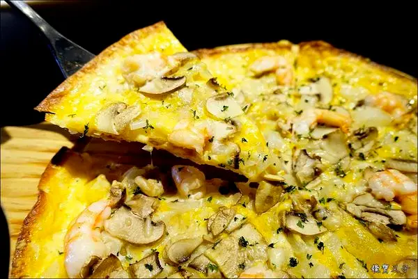 加上碩大的鮮蝦塊,還有三種厚厚的起司:傑克起司、查特起司、帕瑪森起司