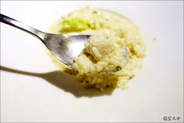 首先外表看得出來有灑上一些起司,遇熱後融化覆蓋在燉飯上,