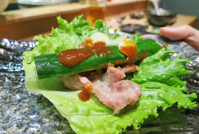搭配生菜、小黃瓜、蒜片,還有店家自製的獨門醬汁,一秒彷彿來到韓國吃燒肉(我們剛不是在日本嗎?