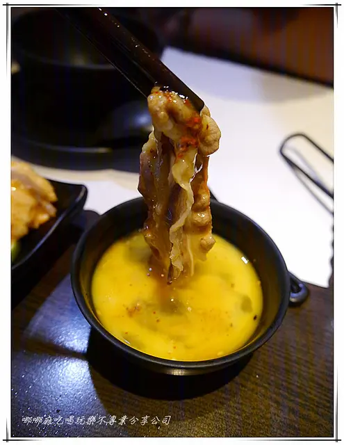 壽喜燒最棒的吃法~將煮好的肉沾上蛋液,