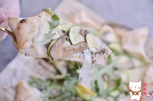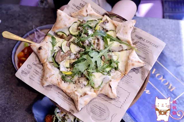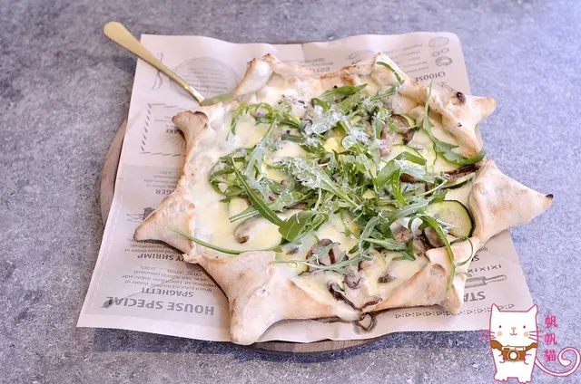 做成星型的披薩難度雖然不高,但還是要比圓形披薩稍微複雜一些,主要是邊邊的部分,需要多一個折的動作,一個不小心折的不好看,就會破壞星型披薩的美感,主要使用的食材是綜合菇、芝麻葉、黃綠櫛瓜、馬札瑞拉冬季松露醬,餅皮屬於鬆軟耐咬的那種,芝麻葉帶點苦味,黃綠櫛瓜增添爽脆口感,馬札瑞拉冬季松露醬讓香氣更濃郁,綜合菇讓披薩有菇菇的甜味,喜歡鹹口味披薩的朋友一定要試試看。