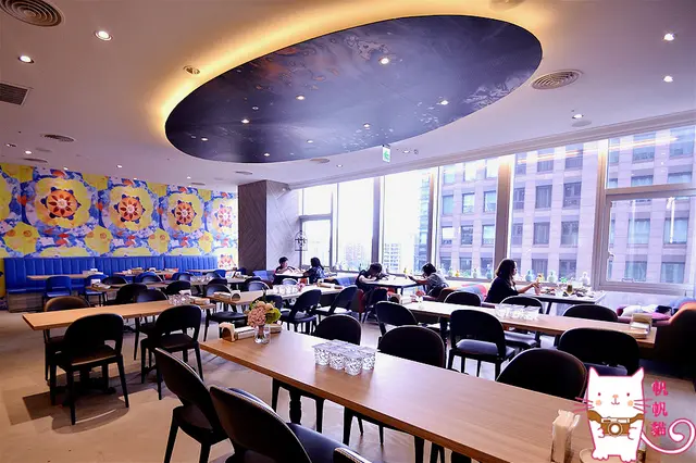 餐廳牆面分別是三位台灣藝術家張騰遠、謝清安、辜琪鈞的創作,入口處是在烈焰中奔跑的馬兒,有著藍、紅、綠相間的元素,身上的樹枝伸展,感覺像是寓意著大地一年四季的變換。