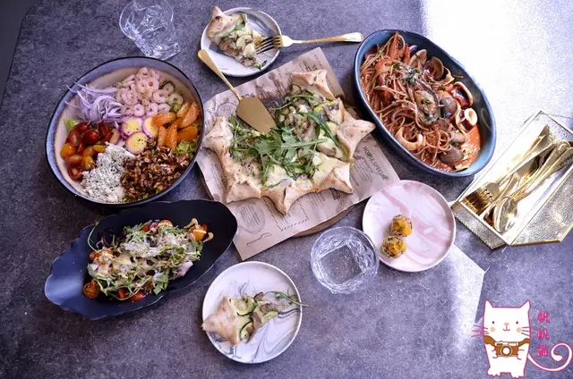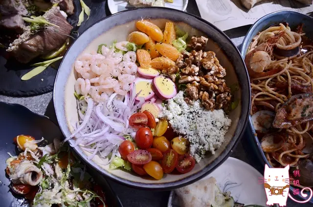 當然VAVAVOOM的餐點也是一大特色,我們點了彩虹酪梨沙拉、炭烤港灣魷魚、漁夫海鮮義大利麵、星型松露野菇披薩、燒烤油封盤克夏聖路易排,跟兩杯飲料:極光、草莓火龍果牛奶。
