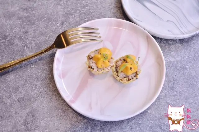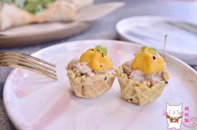 這個一口咬的小點心很可愛,乍看之下好像是用冰淇淋的甜筒餅乾做的,但其實是咖哩做的餅皮,裡面有洋蔥丁跟辣鮪魚吃起來有點辣辣的,上面是紅蔔蔔奶油泡泡,黑黑的是黑橄欖還有山蘿蔔苗,那個辣只是挑逗味覺的那種微辣,更多是洋蔥味撲鼻而來,越咬紅蘿蔔奶油泡泡的香甜才會包覆其中。