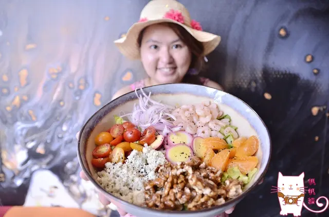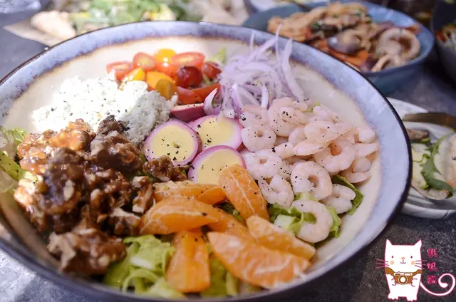 是VAVAVOOM主打沙拉之一,是七種顏色搭配的沙拉,份量十足,比臉還大,胃口小一點的女生,吃這個就很有飽足感,底層是蘿蔓生菜, 蜂蜜核桃先烘烤過,吃起來有焦糖味會比較黏牙,有點像帆帆貓老爸愛吃的花生糖,藍紋起司跟酪梨醬汁混搭,所以儘管沒有看到酪梨肉,也會吃的到酪梨香,粉色的蛋是用甜菜根醃漬過的水煮蛋,加上新鮮的蝦仁、洋蔥、番茄、橘子,吃之前先拌均勻,會有不同層次的口感融入其中。