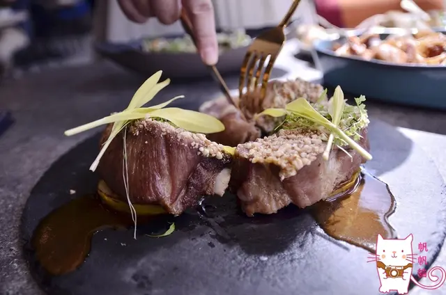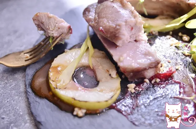 盤克夏豬排對於台灣人來說比較陌生,但是在歐美已經有滿多餐廳用這種豬肉當作料理,現在南部也有養殖,盤克夏豬排的特色就是不柴偏甜,採用半烘乾式的作法,裡面是低溫烘烤,肉質呈現淡粉色,撒上杏仁粒並放了玉米花,醬汁用的是盤克夏原有的肉汁及黑醋栗醬,底下是烤過的青蘋果,有點像是分子料理的做法,吃起來肉肉的油脂豐厚,主要集中在筋的部位,杏仁粒讓豬排的香氣更溫潤,不過真正能凸顯豬排味道的是底下青蘋果,因為酸酸甜甜去掉豬肉比較油的部分,吃起來更爽口。