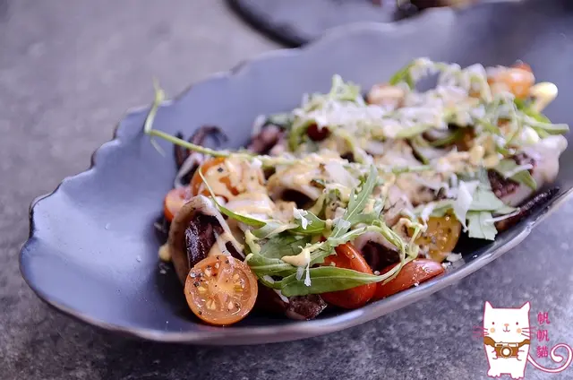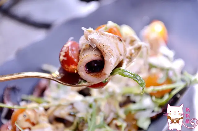 上面是檳榔花,是檳榔在結果實前的花,吃起來略帶點脆度,還有芝麻葉跟小番茄,加上帕瑪森起司,裡面用的是本土蝦跟南部的魷魚,吃起來Q度跟咬勁十足,淋上了蜂蜜芥末醬汁,讓鮮味的魷魚也能有多層次的味道。