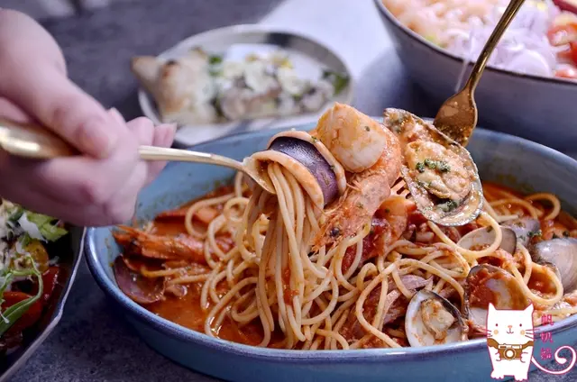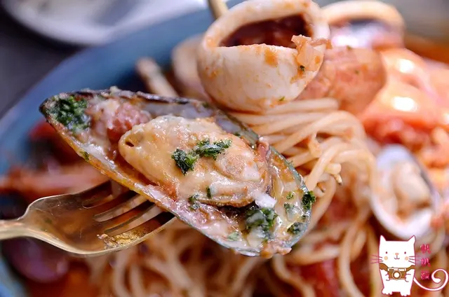 漁夫海鮮義大利麵:用白酒調味,食材有義大利麵、番茄、蛤蠣、南部的魷魚、白蝦、干貝、淡菜,吃第一口讓我想到法國的馬賽魚湯,湯的鮮度很像,每一口都像在海裡游泳一樣,尤其有我愛的番茄調味倍覺鮮甜,魷魚咬下去覺得Q後來是有股滑溜感,特別適合在這面像是宇宙的畫作牆面前拍照,還有吸附茄汁的嫩干貝也千萬別錯過了啊!