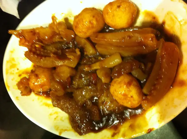 "咖哩三寶"是由魚皮、魚蛋和魷魚組合而成每一種食材都吸附著咖哩醬汁香濃夠味