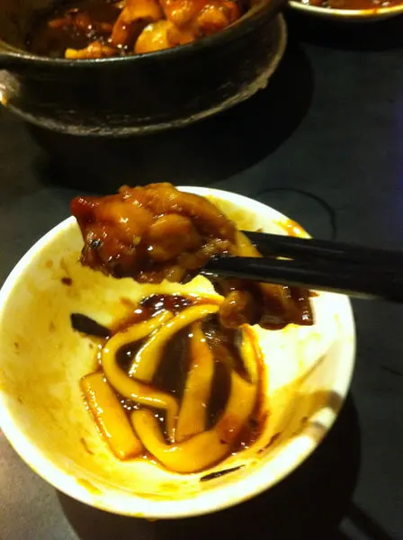 這是本店的招牌"花雕雞"一整隻雞腿料理的時間和肉質的維持以及醬汁的調配都恰到好處鹹香帶點微微的花雕酒香Q彈的粄條也大大加分
