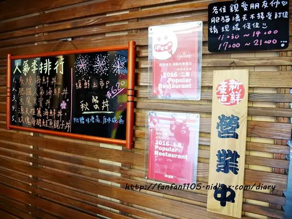 肥貓漁夫店門口寫著丼飯的人氣排行榜,若是第一次來的人可以參考看看喔!
