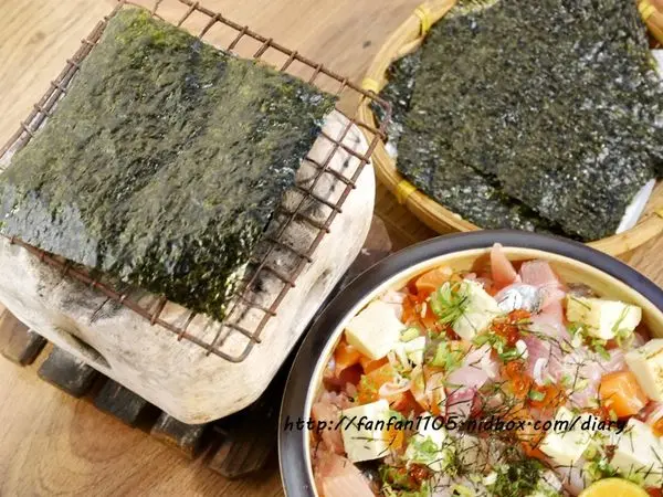 可以先將海苔放上烤爐,正反面約2秒,再包入散壽司,自己DIY好吃又好玩