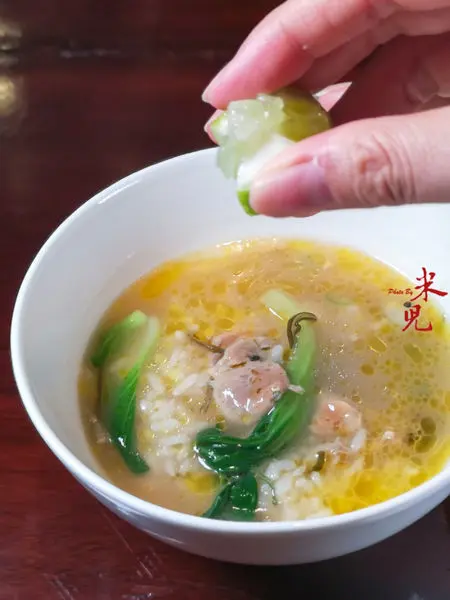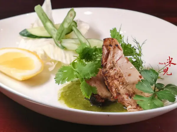 泰式米湯鴨肝是主廚獨家將傳統泰式湯品豪華升級,於慢煮而成的牛高湯中加入台梗九號米燉後熬成稀飯,再加入煙燻過後的鴨肝造就滑順鮮美口感,最後綴上魚子醬而成。煙燻鴨肝在酸香的湯汁裡風味特別突出,讓我忍不住吃個碗底朝天。