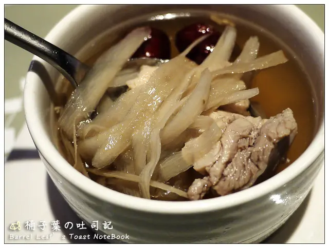 裡頭的雞肉約兩塊,不過口感沒有很優,牛蒡絲是切條狀,主要是喝湯頭~湯頭甜順,葉子非常愛呢!