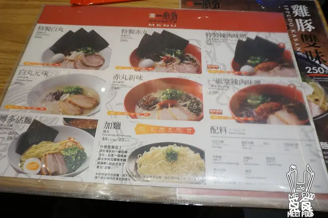 一風堂雖然依照分店菜單有所不同不過白丸、赤丸、辣肉味噌跟博多沾麵基本上是定番詳細的菜單資訊可以看這裡:http://goo.gl/pWdsyz
