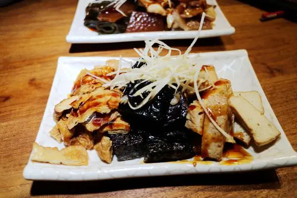 這一盤有甜不辣、豬血糕及豆乾,都是滷味小菜中不容錯過的選項。