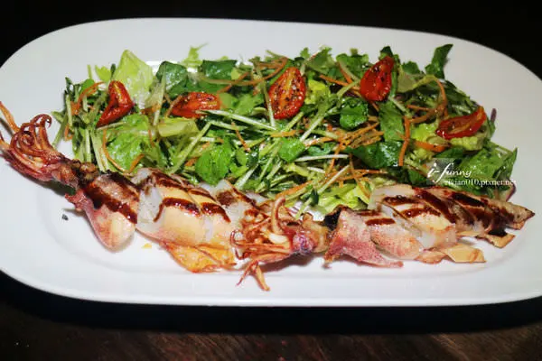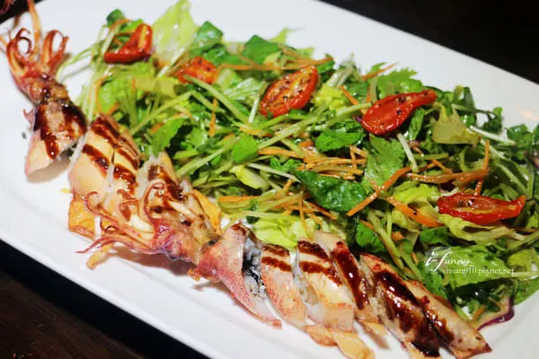 特選來自宜蘭的優質小卷,新鮮看得見,煎至表面焦香,再淋點巴薩米克醋。