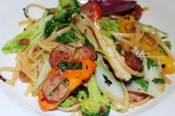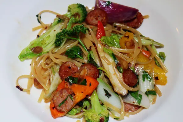 將香腸取代義式臘腸,再加入大量蔬菜,清炒蒜香沒有過重調味,展現主廚的功力。