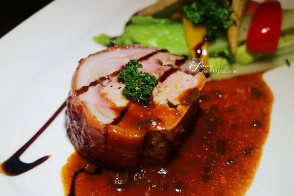 待拍完照之後,主廚貼心地將乳豬分切為一人份,放上烤蔬菜且淋上特製醬汁上桌。