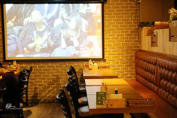 靠牆的座位以高背沙發為主,磚牆上的大電視,播放著體育台的賽事。