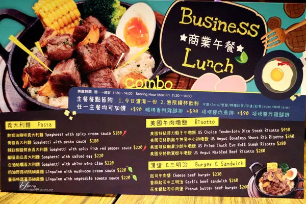 週一~週五11:30~14:00供應商業午餐,有義大利麵、燉飯、漢堡及三明治可選擇。