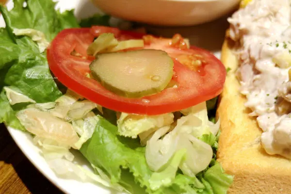 這生菜、蕃茄及酸瓜,可放置在三明治上搭著吃,也可單吃。