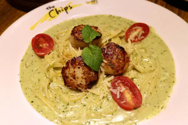 熱奶油鹽煎干貝蘿勒細扁麵 $350