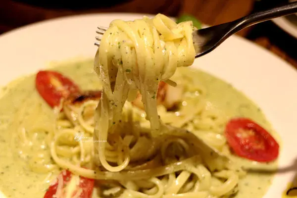 滿滿的醬汁裹附在麵條上,奶香青醬香,味道綜合得也很不錯。