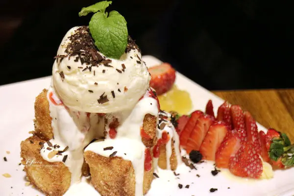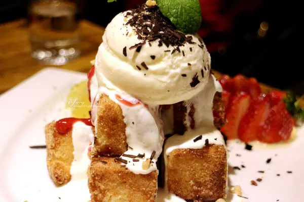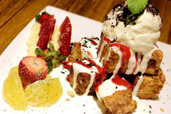 吐司塊上頭除了好吃的冰淇淋之外,還淋上了自製的優格醬,可以中和一下過甜的口感,