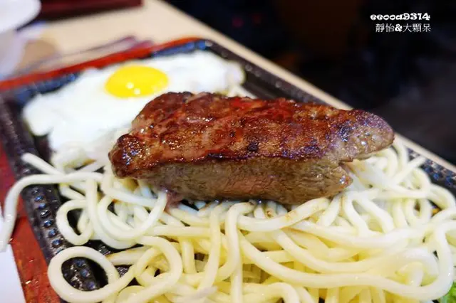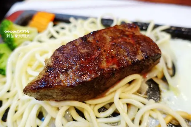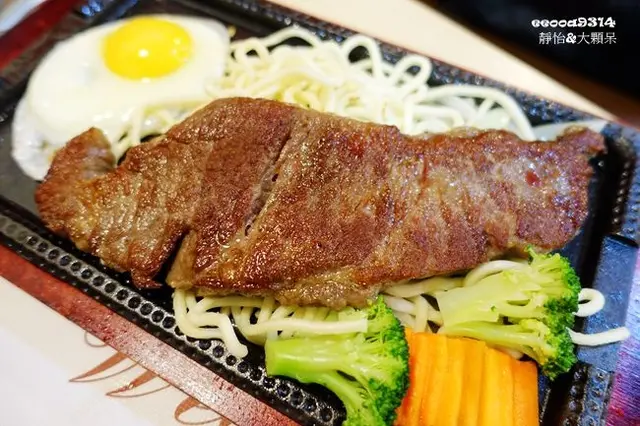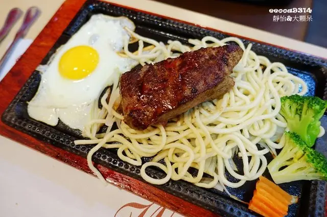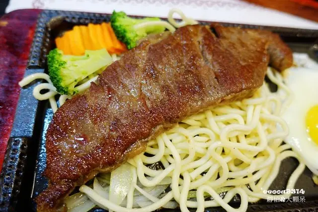 每一份牛排都附有鐵板麵、青菜及太陽蛋