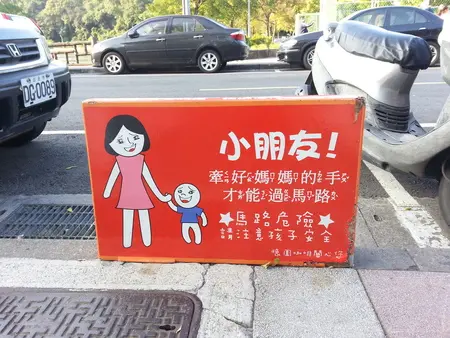這是設置在馬路邊的標語,剛好讓為娘的我對我那皮得不行的三歲丫頭進行機會教育,一定要牽好媽媽的手才能過馬路才安全唷!