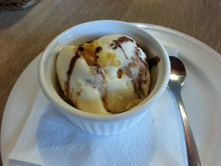 MENU上說要切開中央的布丁放在鬆餅上一起吃將另有風情~於是我就放倒了小象,再切了塊布丁放上去……嗯…看起來厚厚的丁隨時會從小象渾圓的肚皮上滾落…所以,最後我還是決定分別將它們送進我口中,以確保它們的安全! 我要說,這布丁真的也是甜甜ㄉㄨㄞㄉㄨㄞ的,超級好吃,我10個月大的兒子一口接一口吃不停~ 搭配不太甜的鮮奶油和苦甜脆口的巧克力碎餅,真是美味與口感兼具呀!太讓我滿意了!