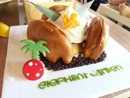 elephant garden字樣是抹茶粉,樹、葉子、松鼠這些裝飾品是巧克力,小象鬆餅圍繞著的是一大塊布丁和不膩口的鮮奶油~腳下踩的泥土是巧克力餅乾碎~