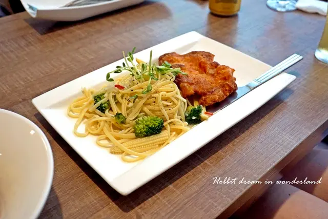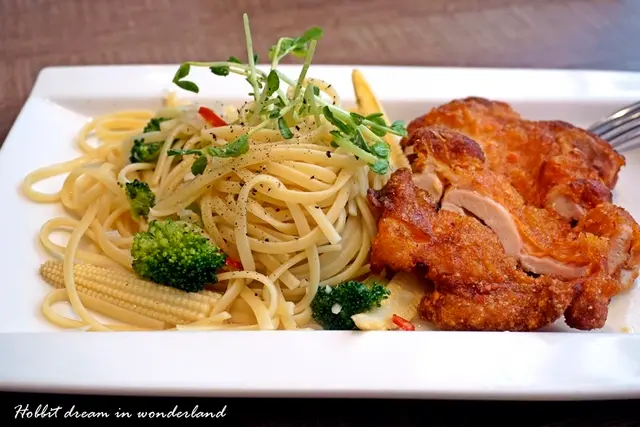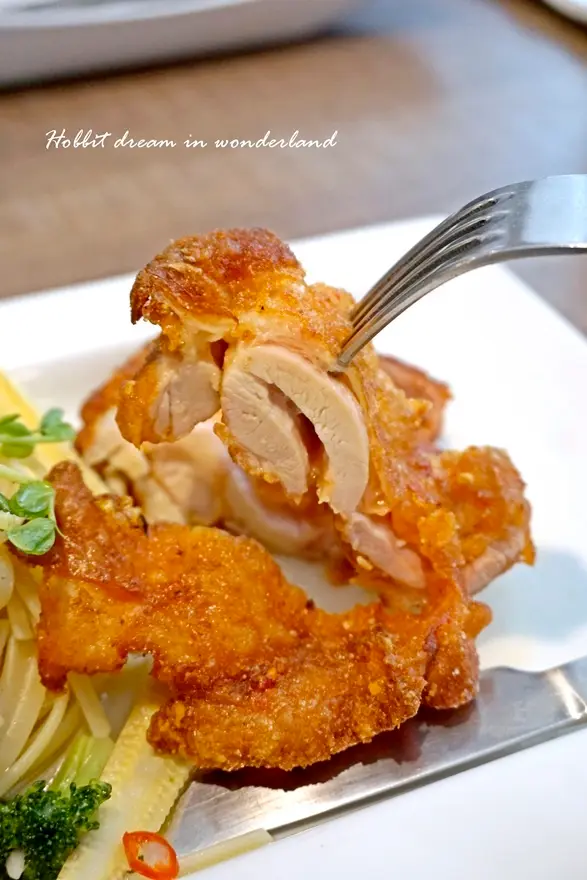 酥炸去骨雞腿排佐清炒鮮蔬義大利麵$260