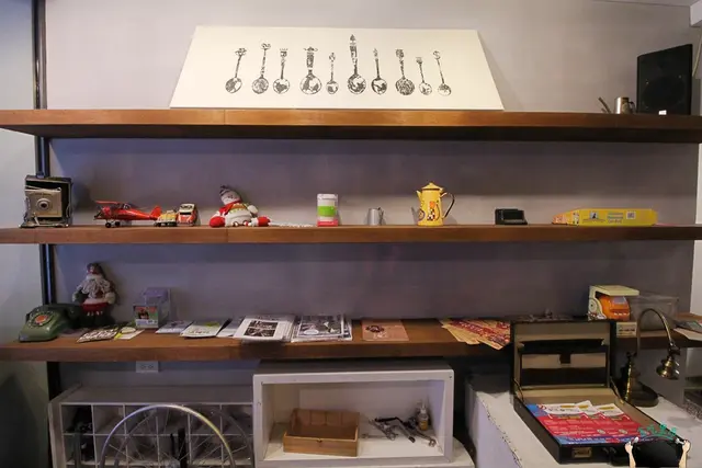 ▲ 長桌對面是放滿小巧裝飾和古式玩物的架子